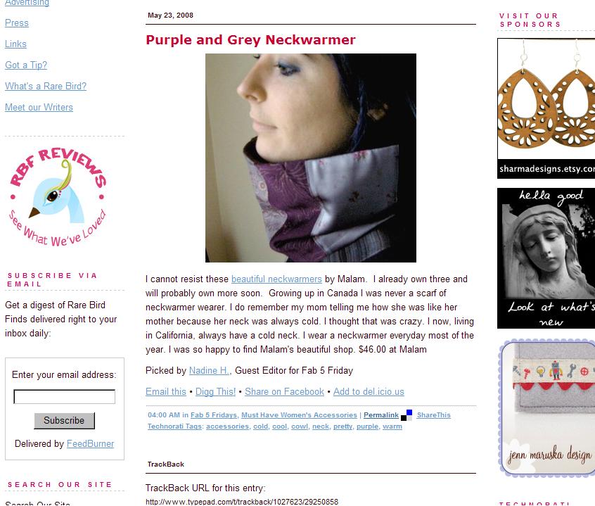Publication MALAM - Vêtements créateur Made in France - Rare Bird Finds 23/5/2008