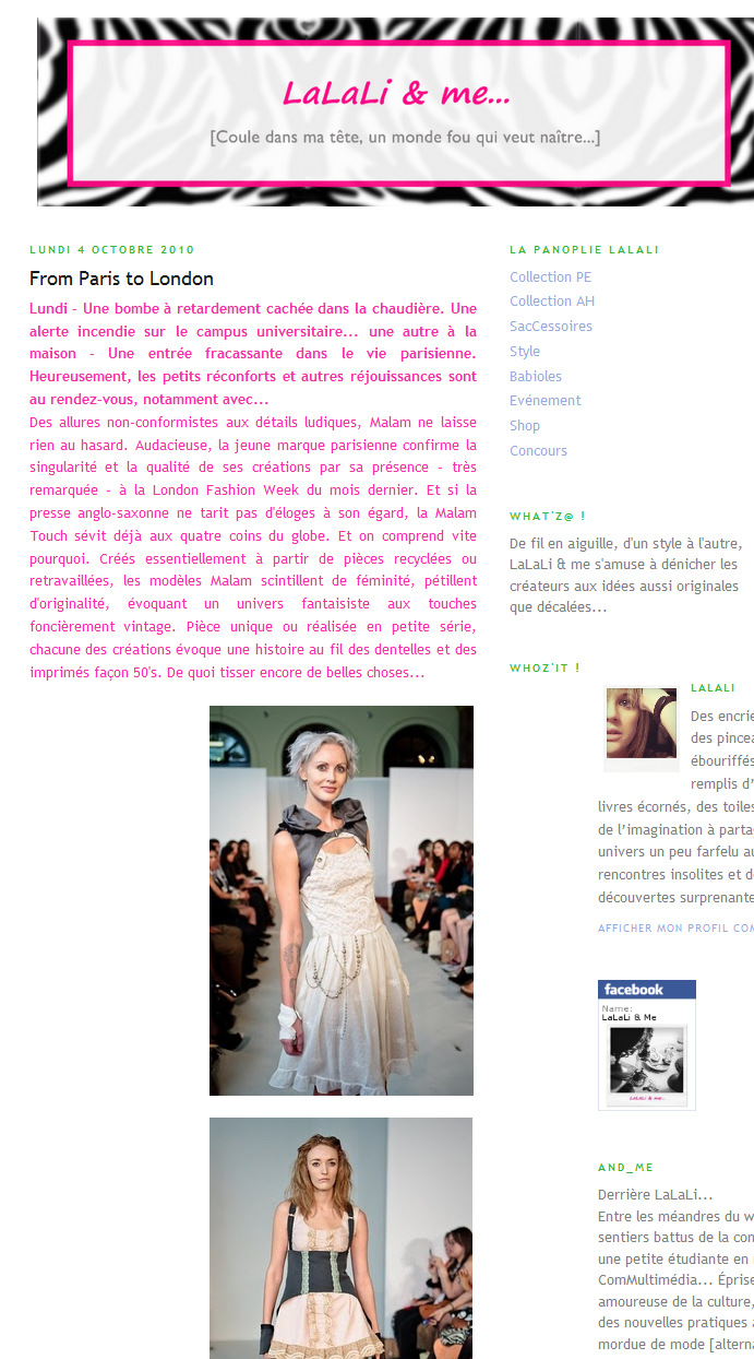 Publication MALAM - Vêtements créateur Made in France - Lalali & Me 4/10/2010