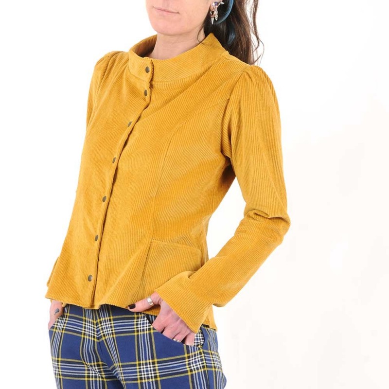 Fitted women's jacket, handmade from slightly stretchy mustard yellow corduroy, with long sleeves gathered at the shoulders, small patched pockets and a small collar.