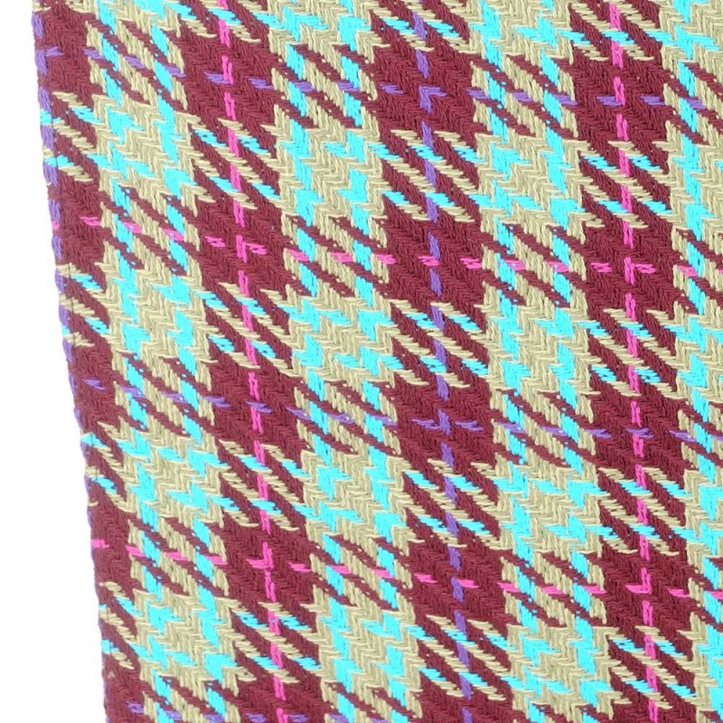 Woven cotton scarf in a crimson red, pink, beige and aqua green checkered pattern.