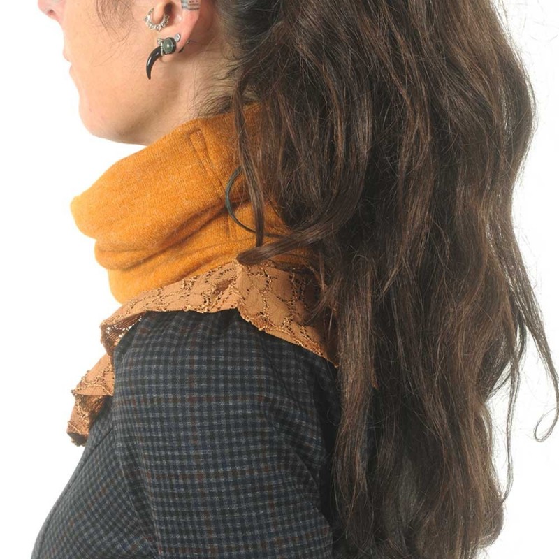 Handmade, pleated cowl in soft mustard yellow stretchy knit, hemmed with assorted lace ruffles.