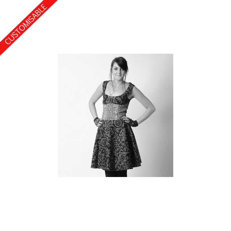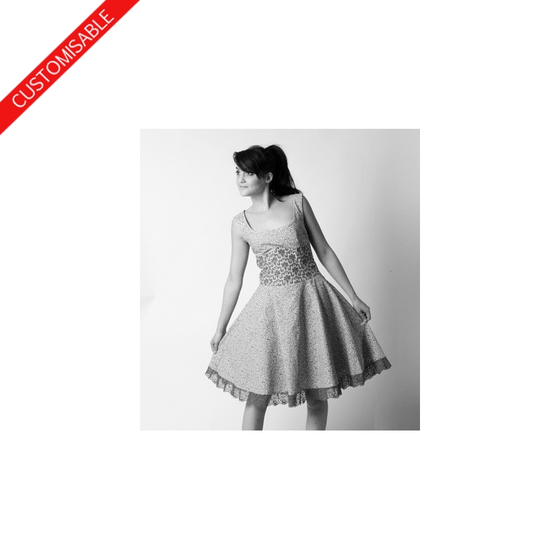 Flared sleeveless dress with wide neckline, and a corset-shaped yoke, handmade in the fabric of your choice.