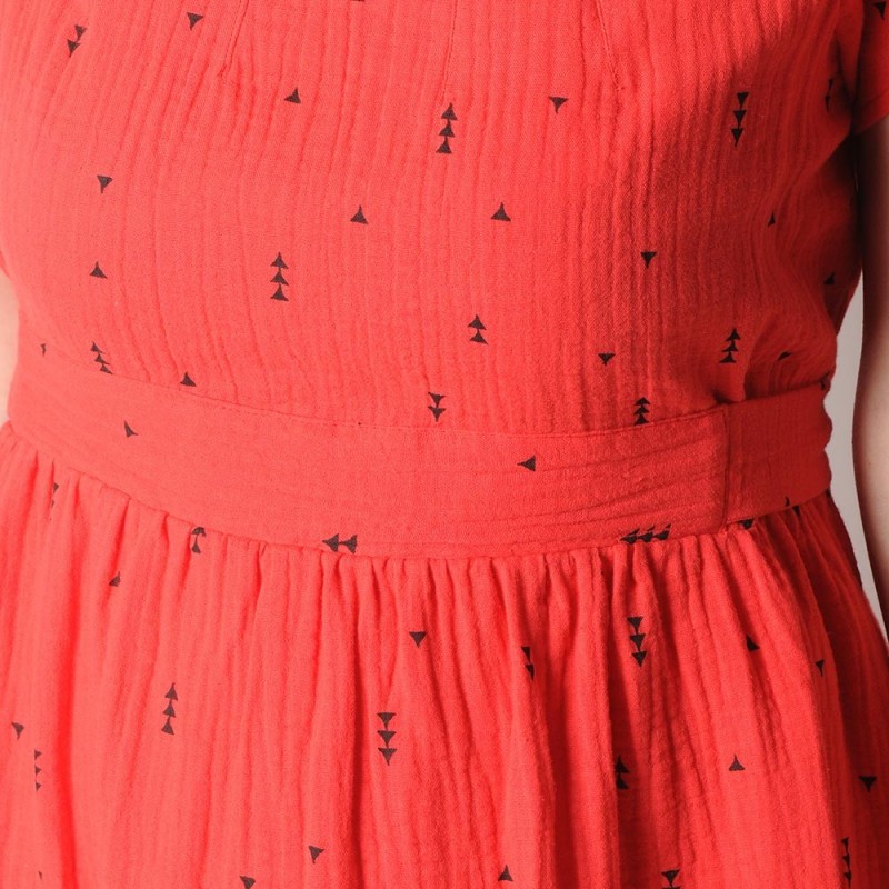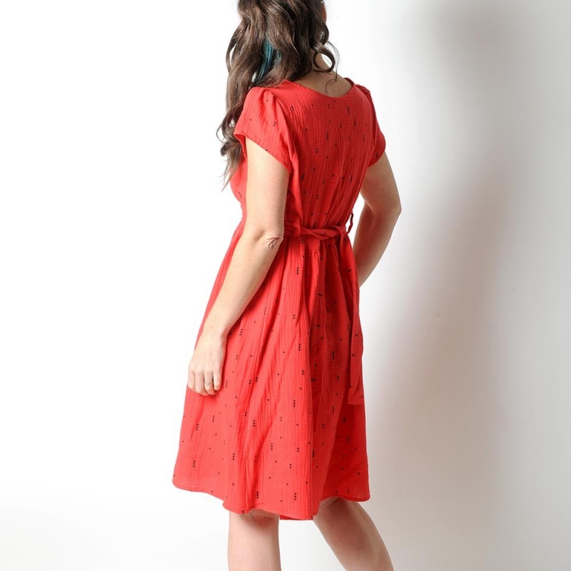 Lightweight, bright red summer dress with short sleeves gathered at the shoulders, tiny pleats at the waist and a belt to knot. It can be worn with the belt loose or tightened at the waist. Handmade from cotton double gauze witha tiny black triangle print.
