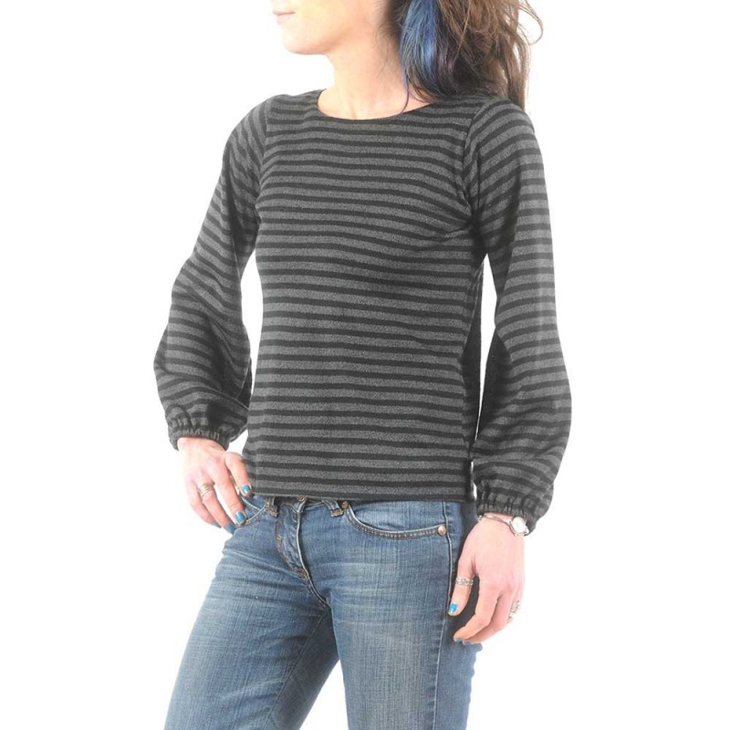 Women's sweater, handmade from lightweight black and dark grey striped knit fabric (50% wool). Features long puffy sleeves elasticated at the wrist.
