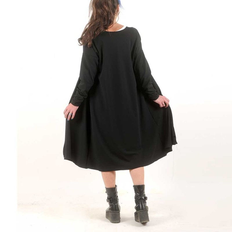 Handmade long and loose open cardigan, with long sleeves shirred near the wrist, in supple black milano jersey with a crepe texture.