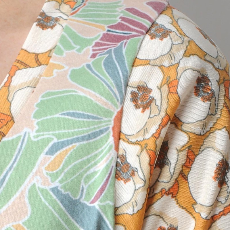 Handmade top in stretchy pastel floral jersey, two different prints. Mid-length sleeves.