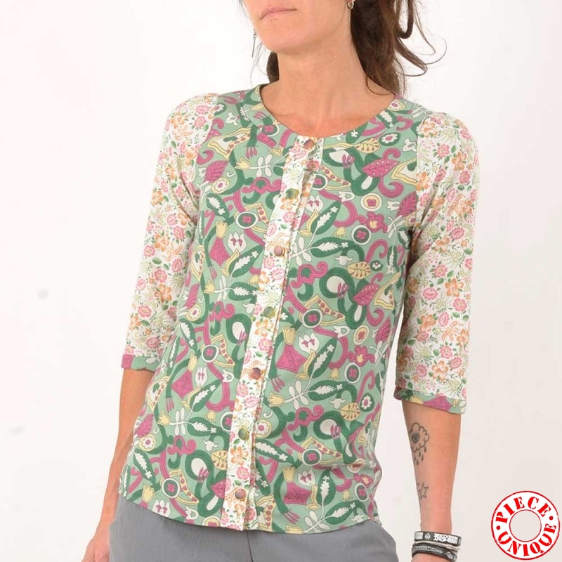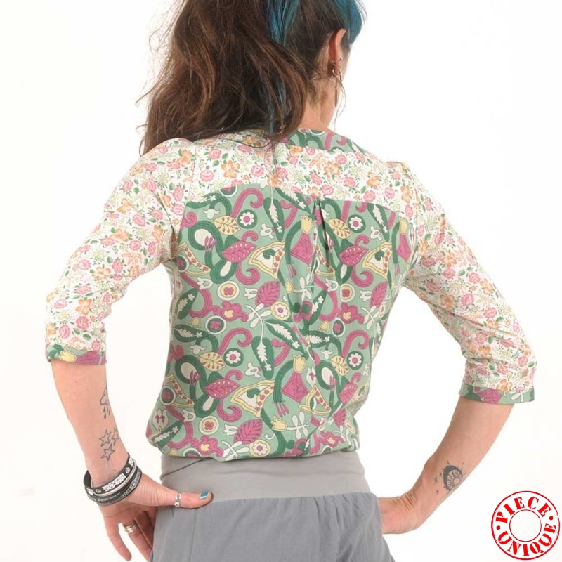 Women's summer shirt with 3/4 length sleeves, handmade from 2 vintage green, pink and white floral fabric.