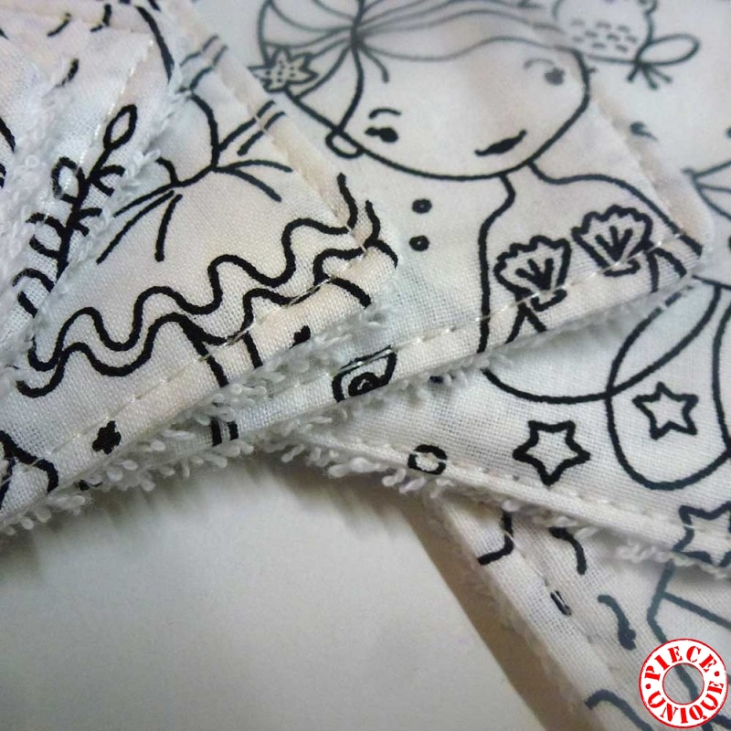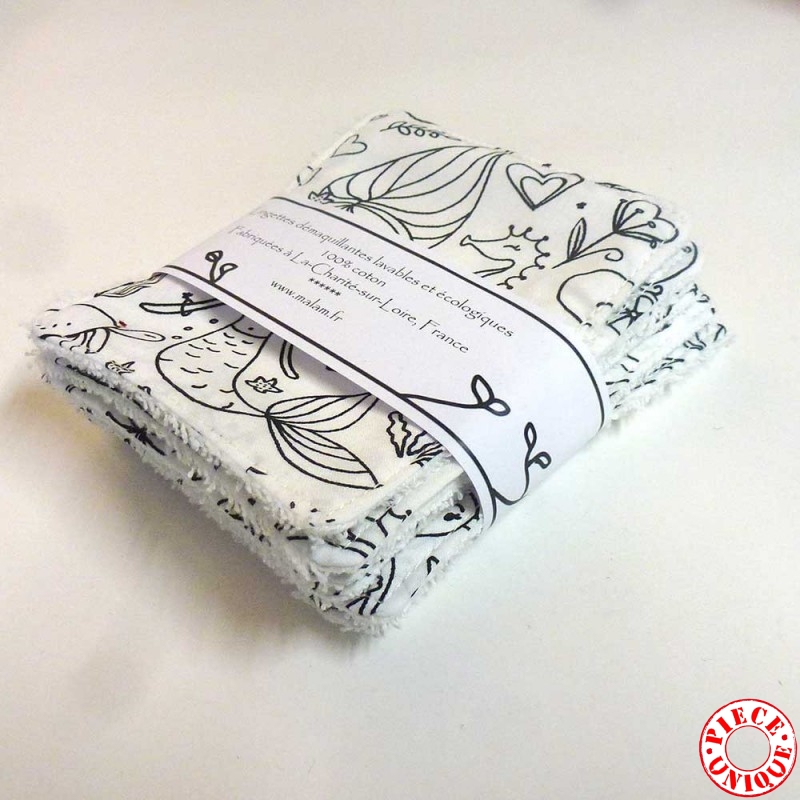 Assortment of 7 washable Zero waste face wipes, in printed white and black cotton fabric. Lined with white cotton terry fabric.