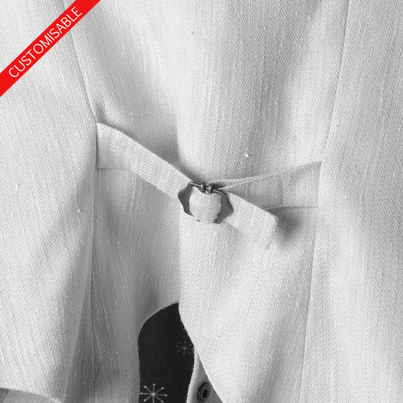 Faites réaliser sur mesure, dans le tissu de votre choix, un gilet sans manches. Entièrement doublé, il comporte un petit col, une encolure arrondie et une patte de resserrage au dos. Il se ferme devant par boutons ou pressions, au choix.