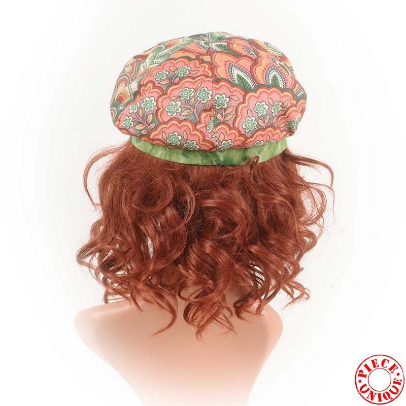 Casquette gavroche réalisée à partir d'un tissu coton vintage fleuri coloré, et coton vert. Entièrement doublée en coton. La forme de la visière est modulable grâce à une légère armature métallique.