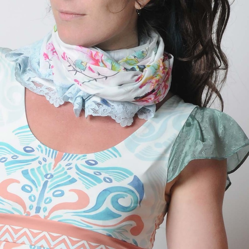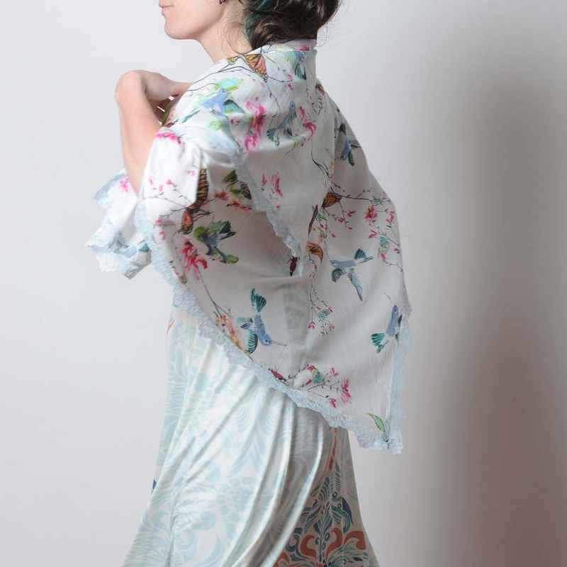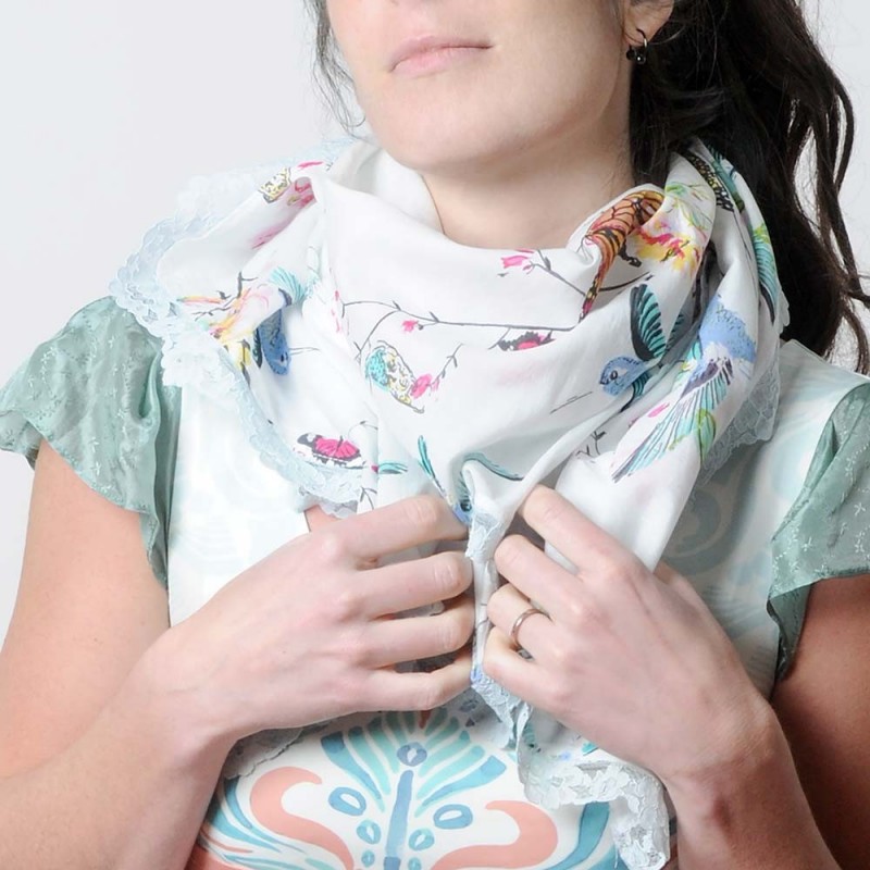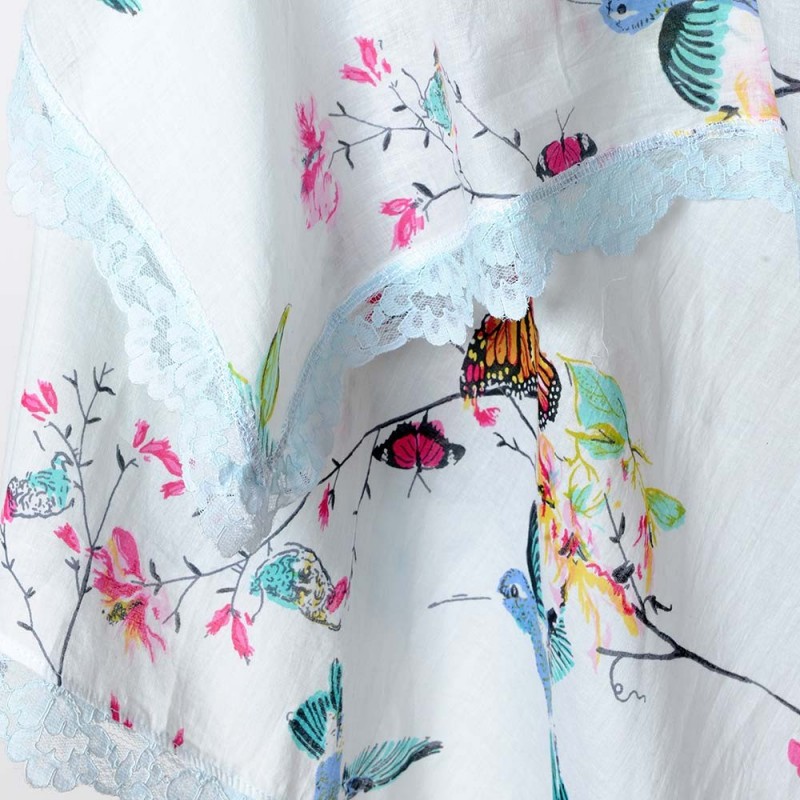 Foulard en coton léger, imprimé de fleurs et papillons colorés sur fond blanc, bordé tout autour de dentelle vintage bleu clair.