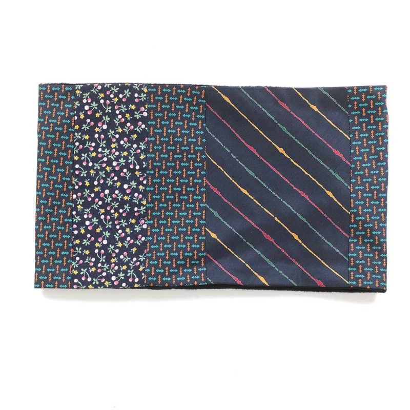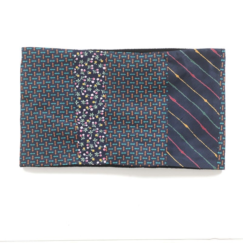 Col- Echarpe tube fait main, rayé de bandes de tissus divers (soie, coton) dans les tons bleu foncé.