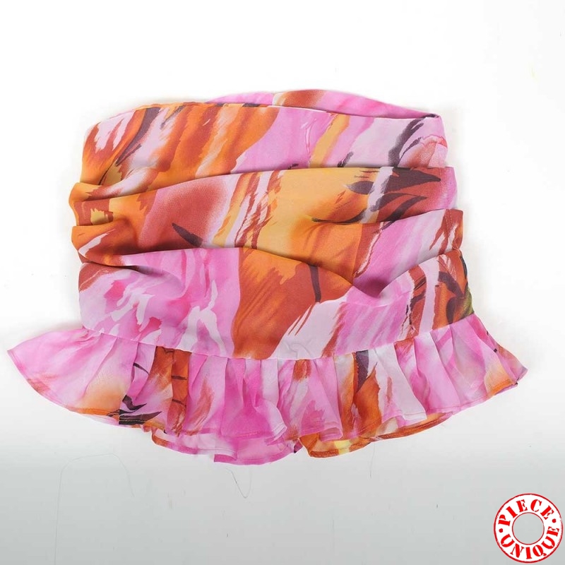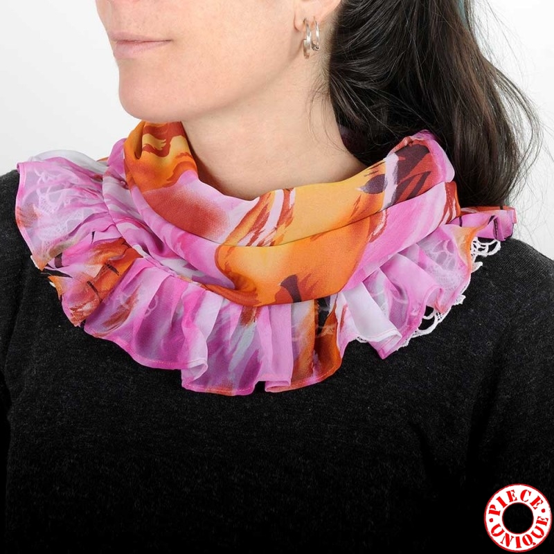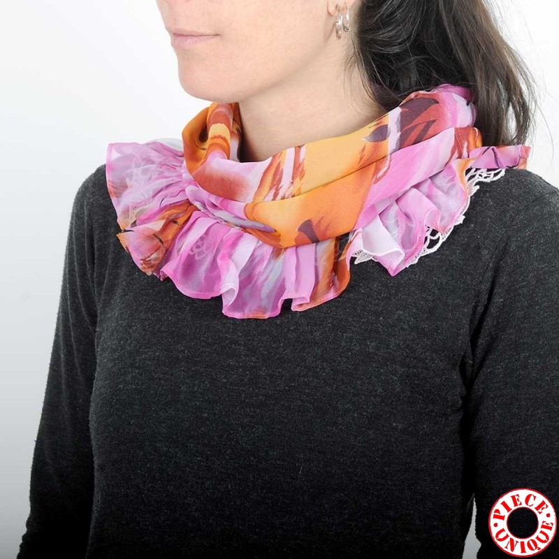 Foulard tour de cou à volants, en voile imprimé rose et orange... pour habiller un top, un décolleté...