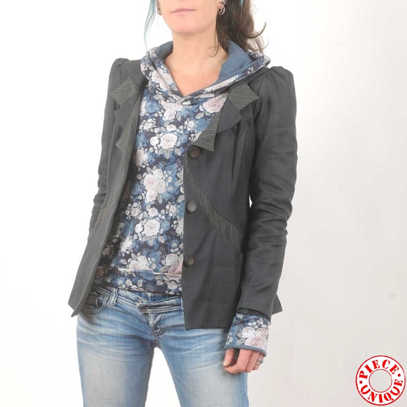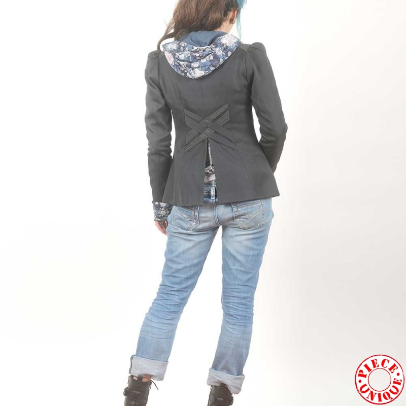 Veste femme cintrée, réalisée en tissu ottoman noir. Découpes devant, aux épaules et dans le dos, dans un tissu gris foncé à fines rayures.