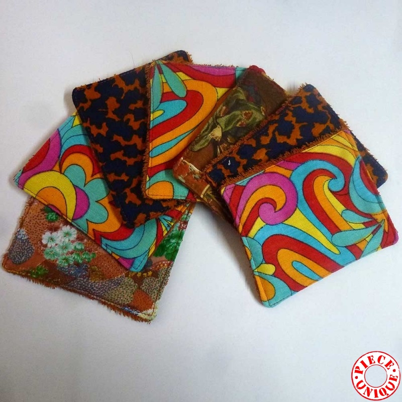 Lot de 7 lingettes lavables Zéro déchet, en tissus coton vintage seventies, doublées de tissu éponge bambou écru. Dimensions : env. 10x12 cm A utiliser en remplacement de vos lingettes et cotons jetables, et lavables à 40° avec votre machine habituelle. POUR D'AUTRES TISSUS, CLIQUEZ ICI