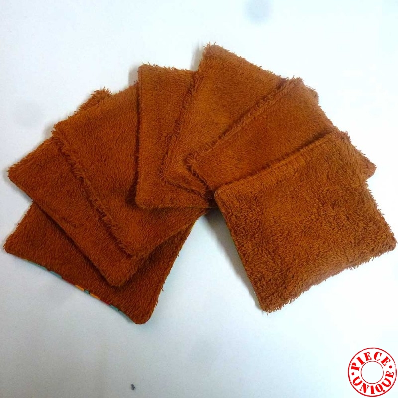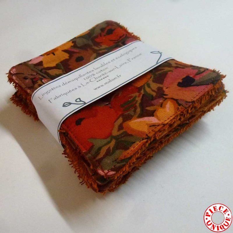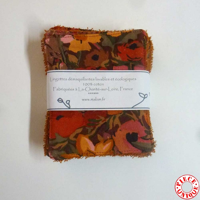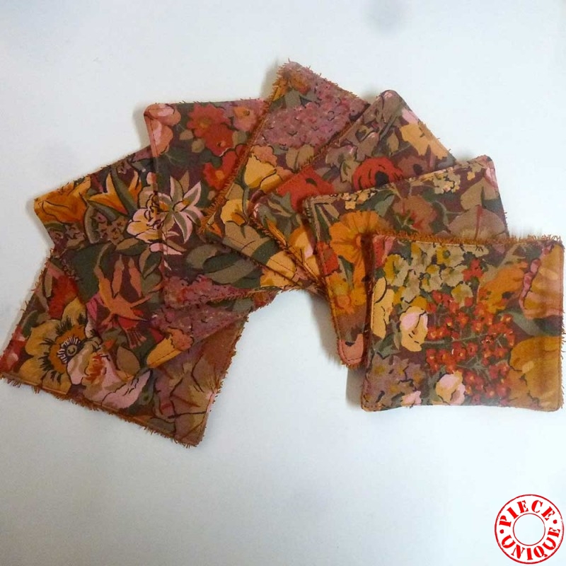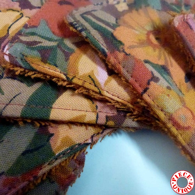 Lot de 7 lingettes lavables Zéro déchet, en tissu coton fleuri ou brodé tons beige, jaune paille, rouille, doublées de tissu éponge coton beige. Dimensions : env. 10x12 cm A utiliser en remplacement de vos lingettes et cotons jetables, et lavables à 40° avec votre machine habituelle. POUR D'AUTRES TISSUS, CLIQUEZ ICI