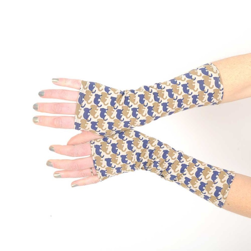 Paire de mitaines réalisées en jersey extensible beige et bleu à motifs de chats.