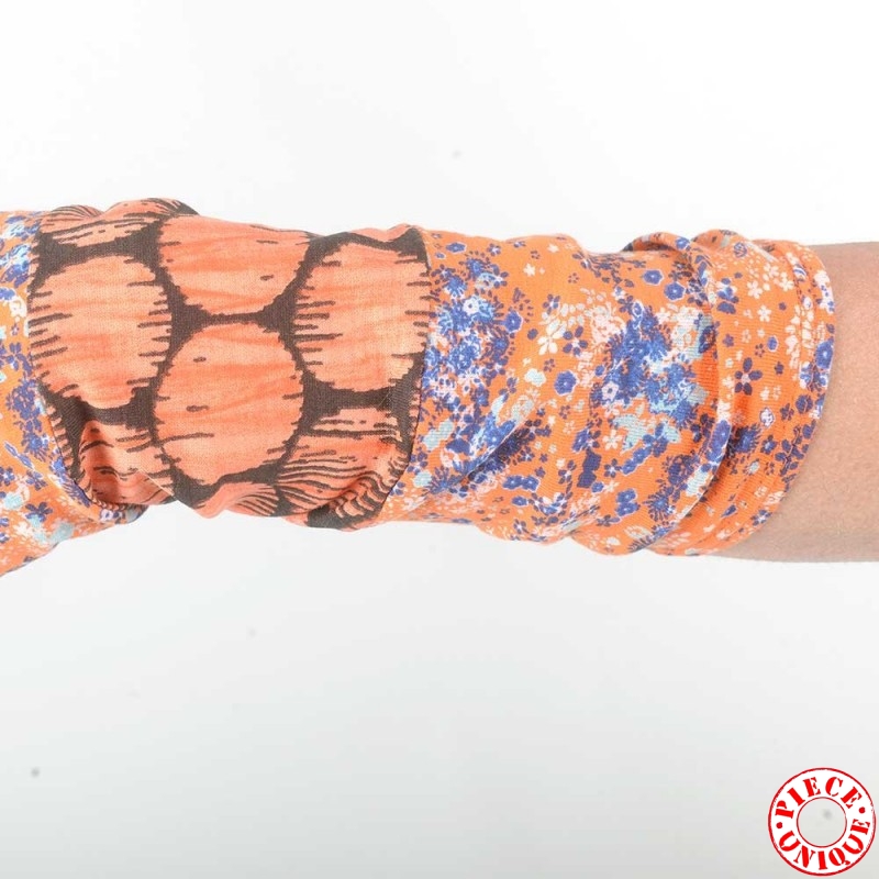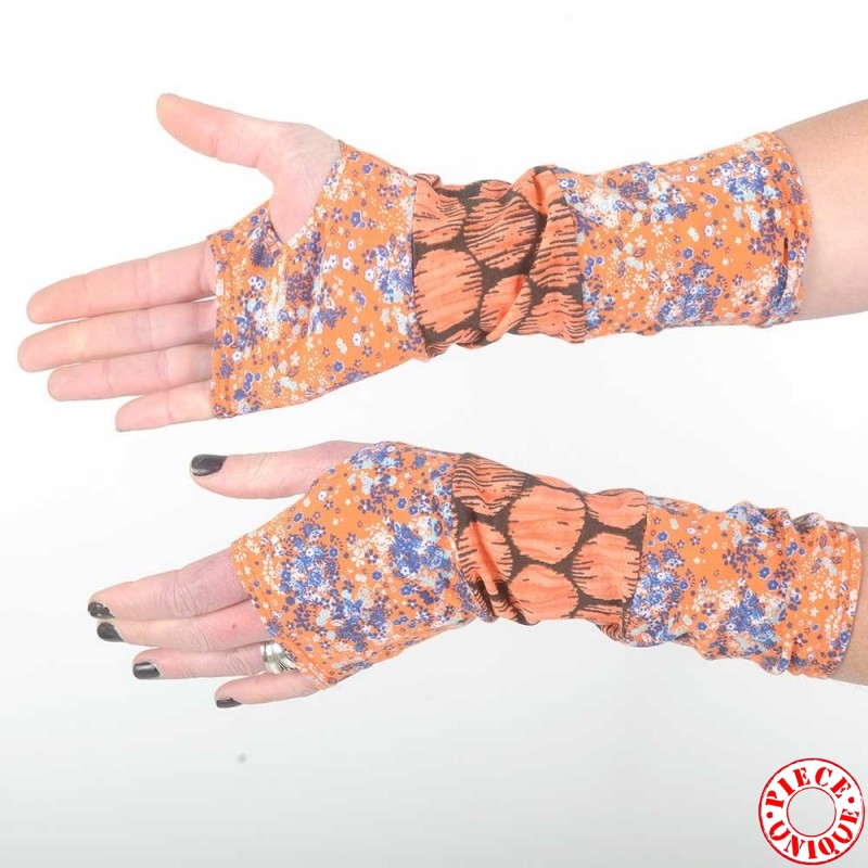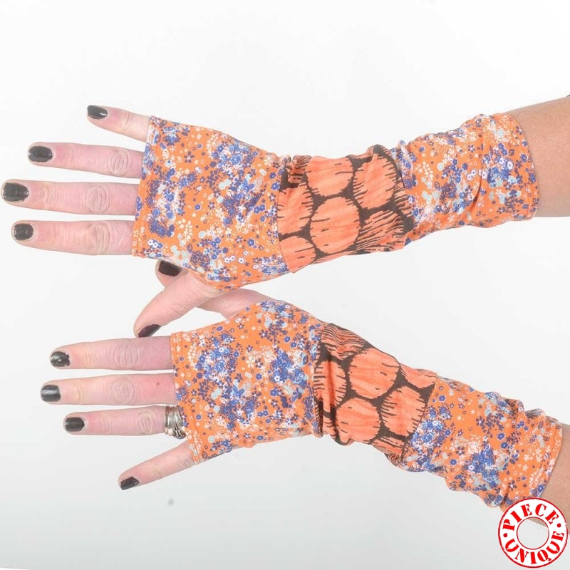 Mitaines longues et extensibles en patchwork de tissus jersey : imprimé cercles noirs sur fond orange et fleuri.