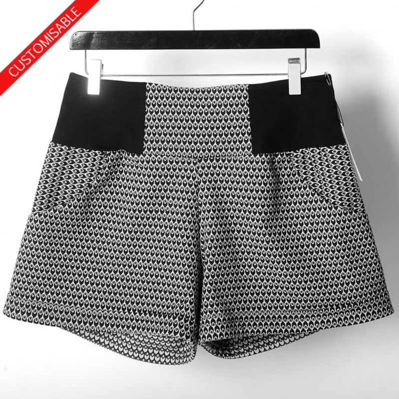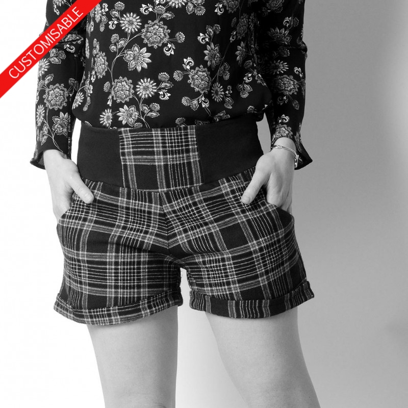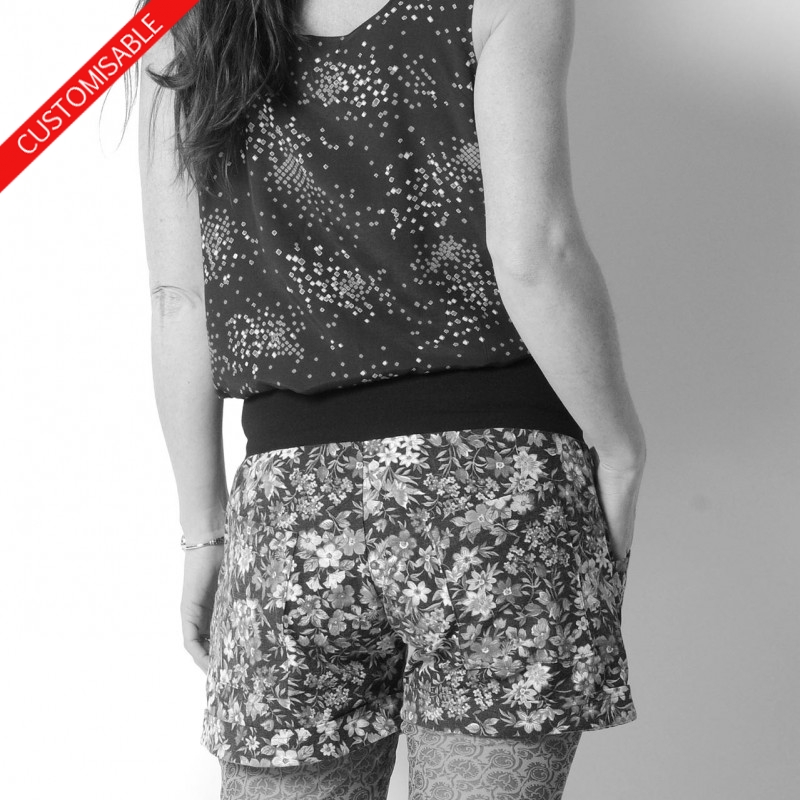 Short femme, à deux poches devant, deux poches plaquées derrière, ceinture extensible en jersey, réalisé dans votre taille, et dans le tissu de votre choix.