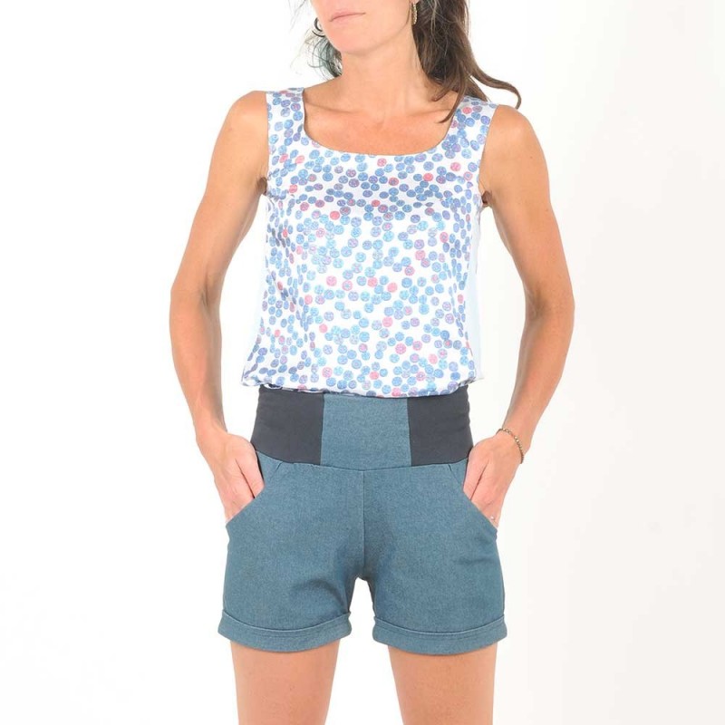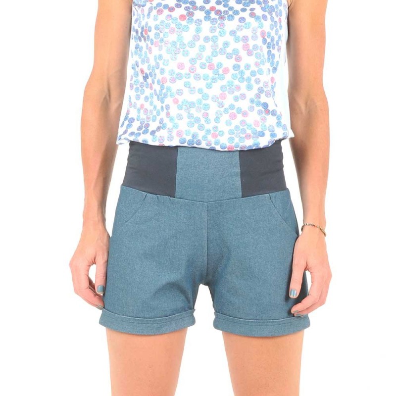 Short femme réalisé à partir d'un tissu denim bleu-vert stretch, à ceinture extensible en jersey bleu marine. Deux poches devant, deux poches derrière.
