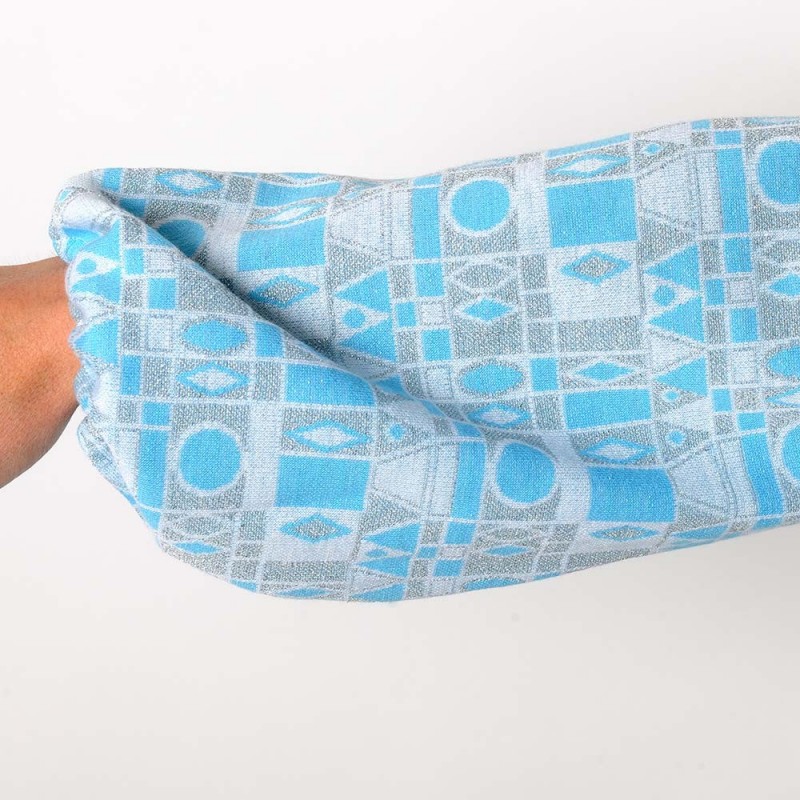 Pull à manches longues bouffantes, élastiquées aux poignets, réalisé en maille jersey vintage à motifs géométriques en blanc, bleu, argenté.