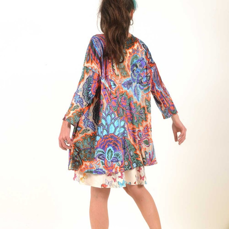 Gilet kimono long ouvert en jersey écru à motifs colorés et argentés en velours.