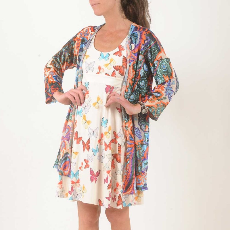 Robe d'été courte en jersey souple viscose imprimée papillons colorés sur fond blanc cassé. Petites bretelles croisées dans le dos en jersey de coton écru. Edition limitée.