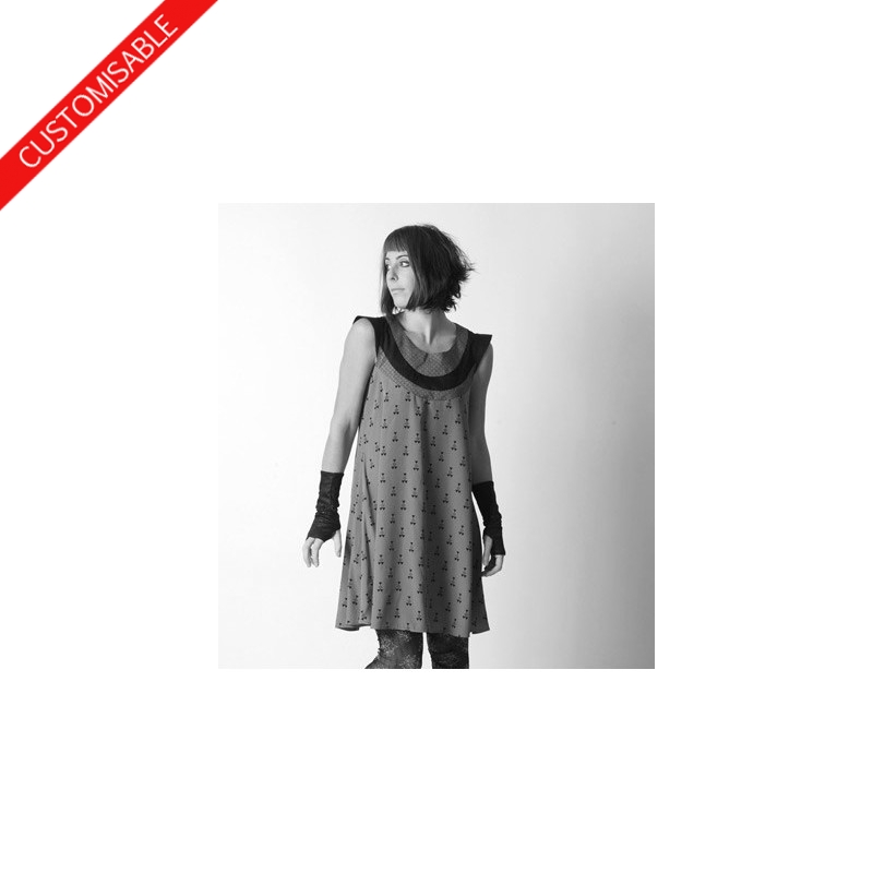 Robe courte évasée à encolure plastron en tissus assortis et petites manches, réalisée dans votre taille, et dans les tissus de votre choix.