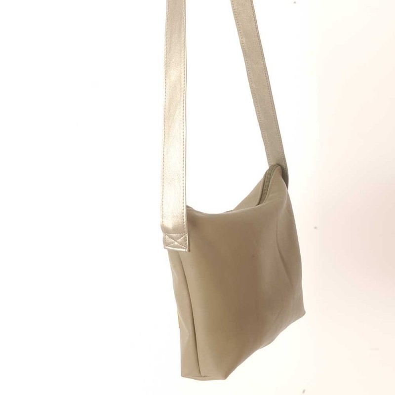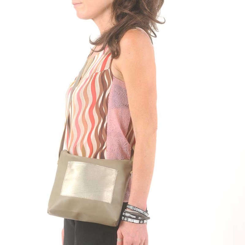 Petit sac bandoulière, réalisé en cuir taupe lisse et simili cuir bronze doré. Fermeture zippée sur le dessus, 1 poche plaquée devant, 2 petites poches plaquées à l'intérieur.