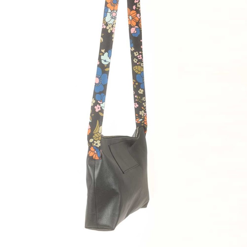 Petit sac bandoulière, réalisé en cuir noir et tissu fleuri rétro coloré. Fermeture zippée sur le dessus, 1 poche plaquée devant, 2 petites poches plaquées à l'intérieur.