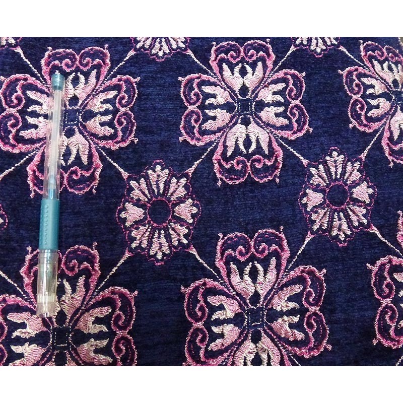 Tissu chenille bleu foncé brodé de motifs floraux roses