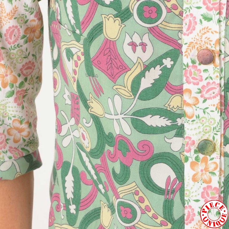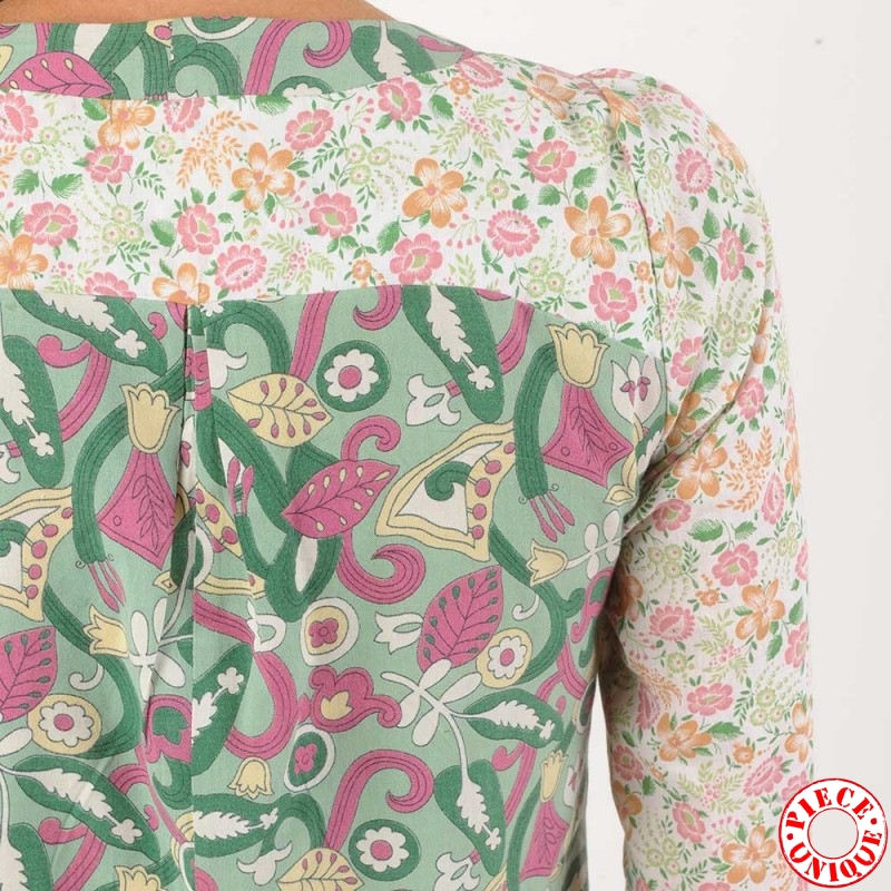Chemisier léger à manches 3/4, réalisé à partir de deux tissus vintage à motif floral dans des tons de vert, rose, blanc.