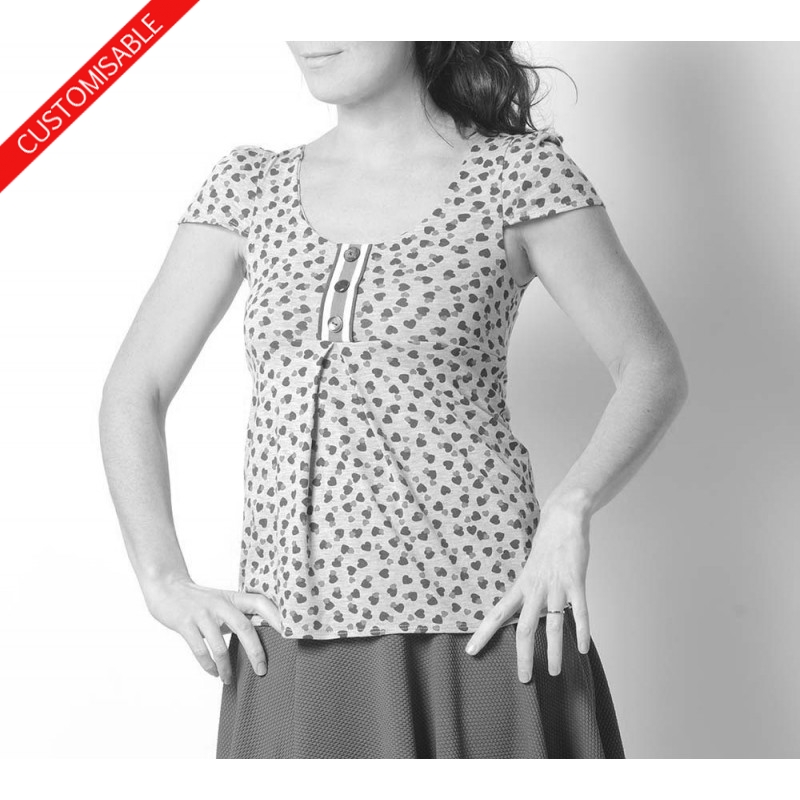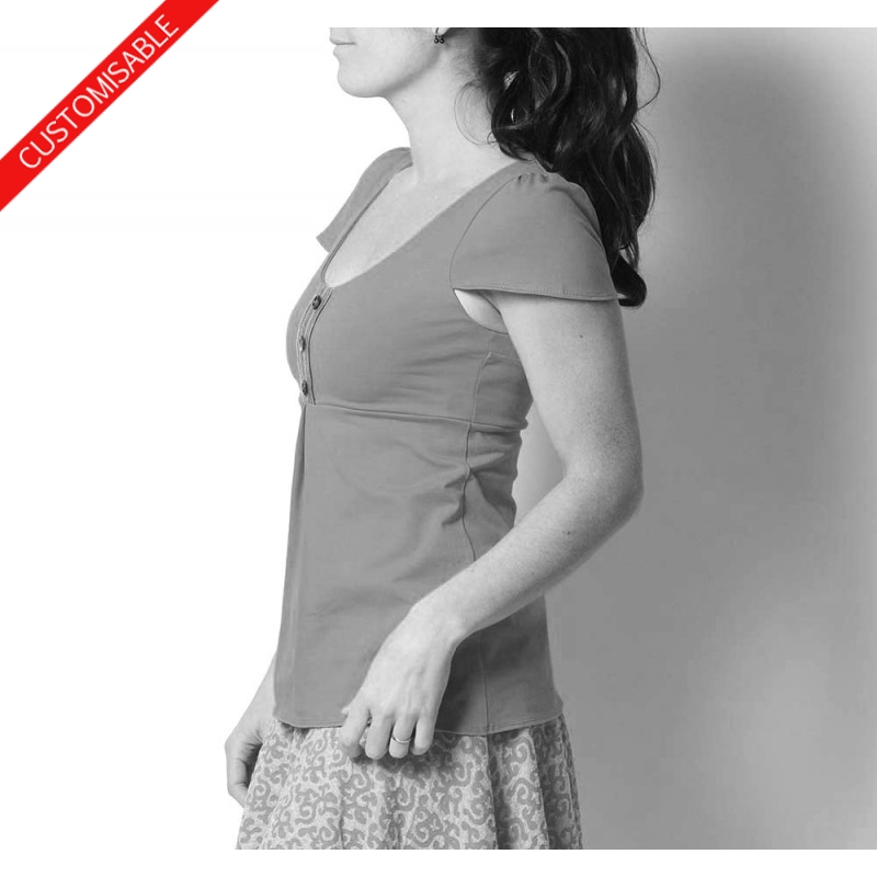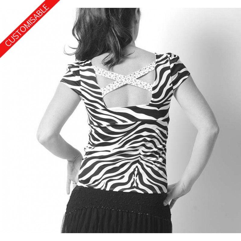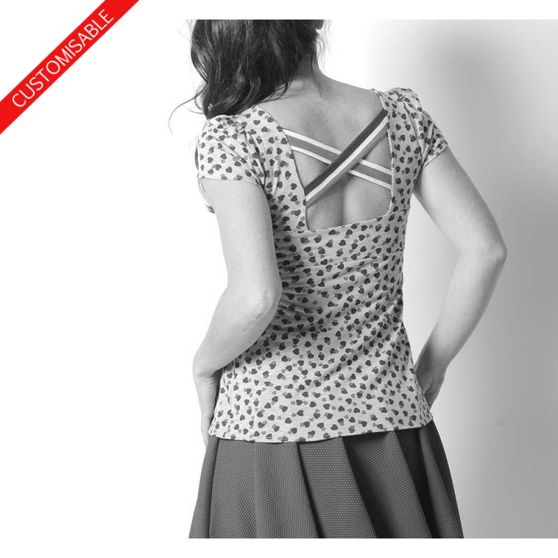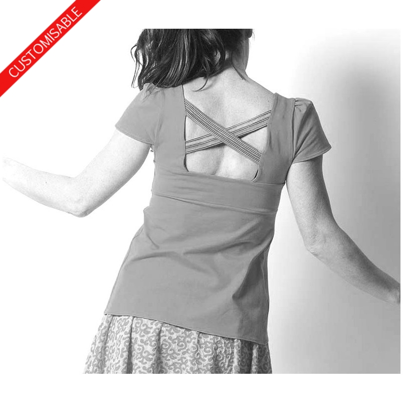 Top en jersey coupe trapèze, à décolleté carré dans le dos comportant deux bretelles croisées, réalisé dans votre taille, et dans le tissu de votre choix.