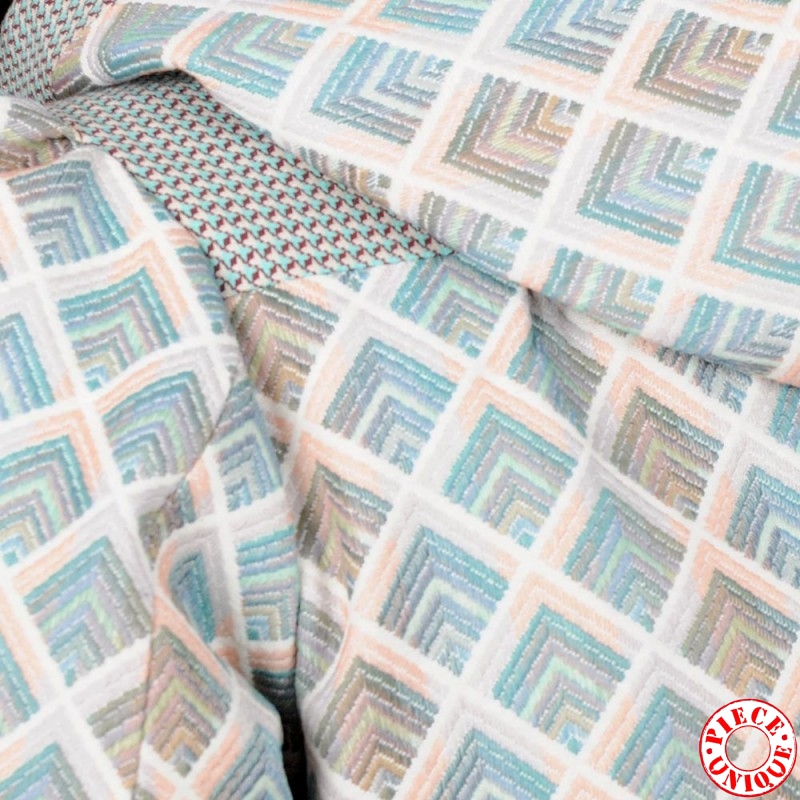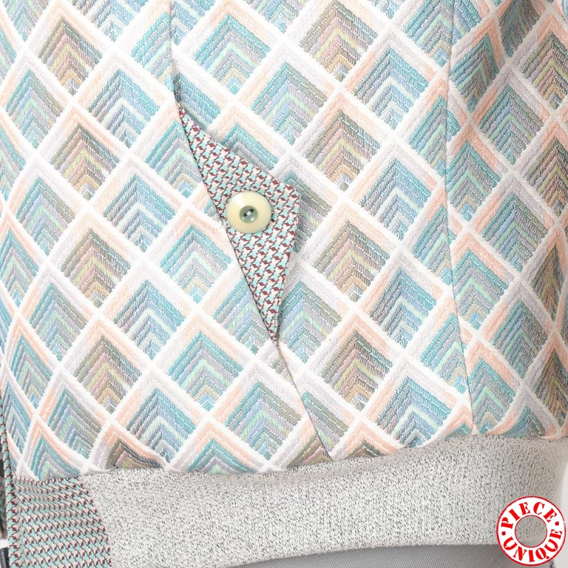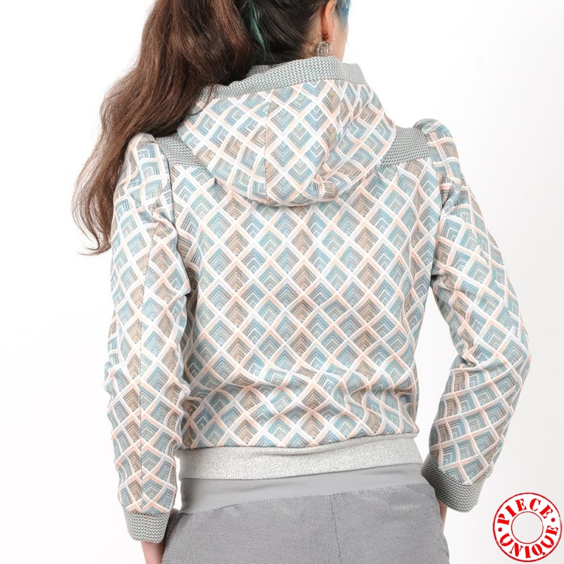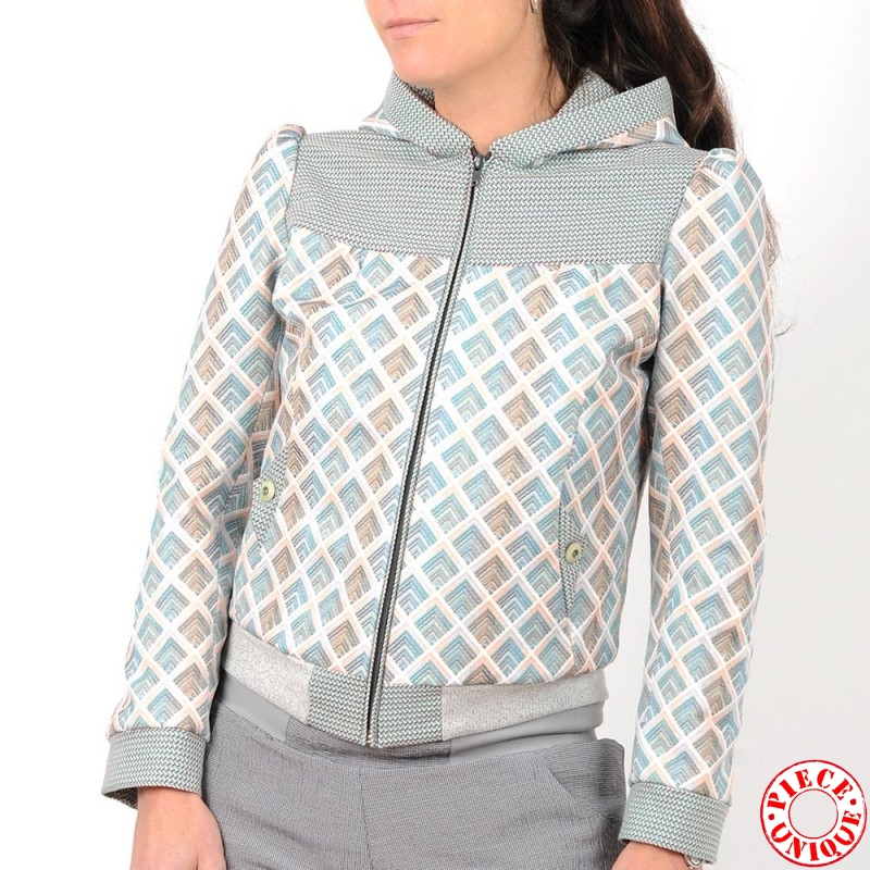 Blouson court zippé à capuche, à manches longues droites froncées aux épaules, réalisée à partir d'un tissu coton épais vintage, associé à un jacquard petit motifs. Entièrement doublé. Deux poches devant, refermables par boutons.