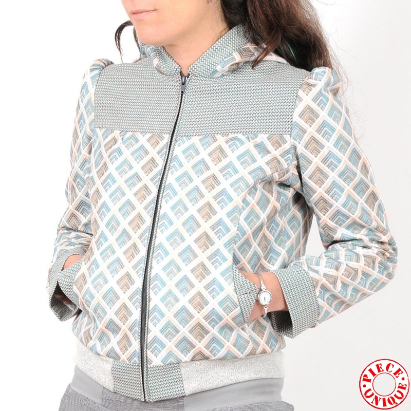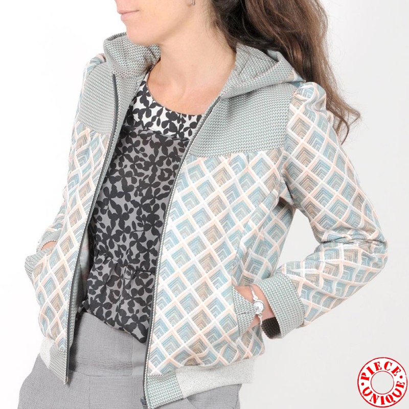 Blouson court zippé à capuche, à manches longues droites froncées aux épaules, réalisée à partir du ou des tissu(s) de votre choix. Entièrement doublé. Deux poches devant, refermables par pressions ou boutons. Indiquez SVP vos mesures dans le formulaire situé en bas de la page avant d'ajouter cette création dans votre panier.Voir les tissus disponibles ici